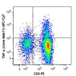 APC/Cy7 anti-human TNF-α; Clone: MAb11; Reactivity: Human, Cross-Reactivity: Chimpanzee, Baboon, Cynomolgus, Rhesus, Swine (Pig, Porcine), Pigtailed Macaque, Sooty Mangabey; Apps: ICFC, FC; Size: 100 tests