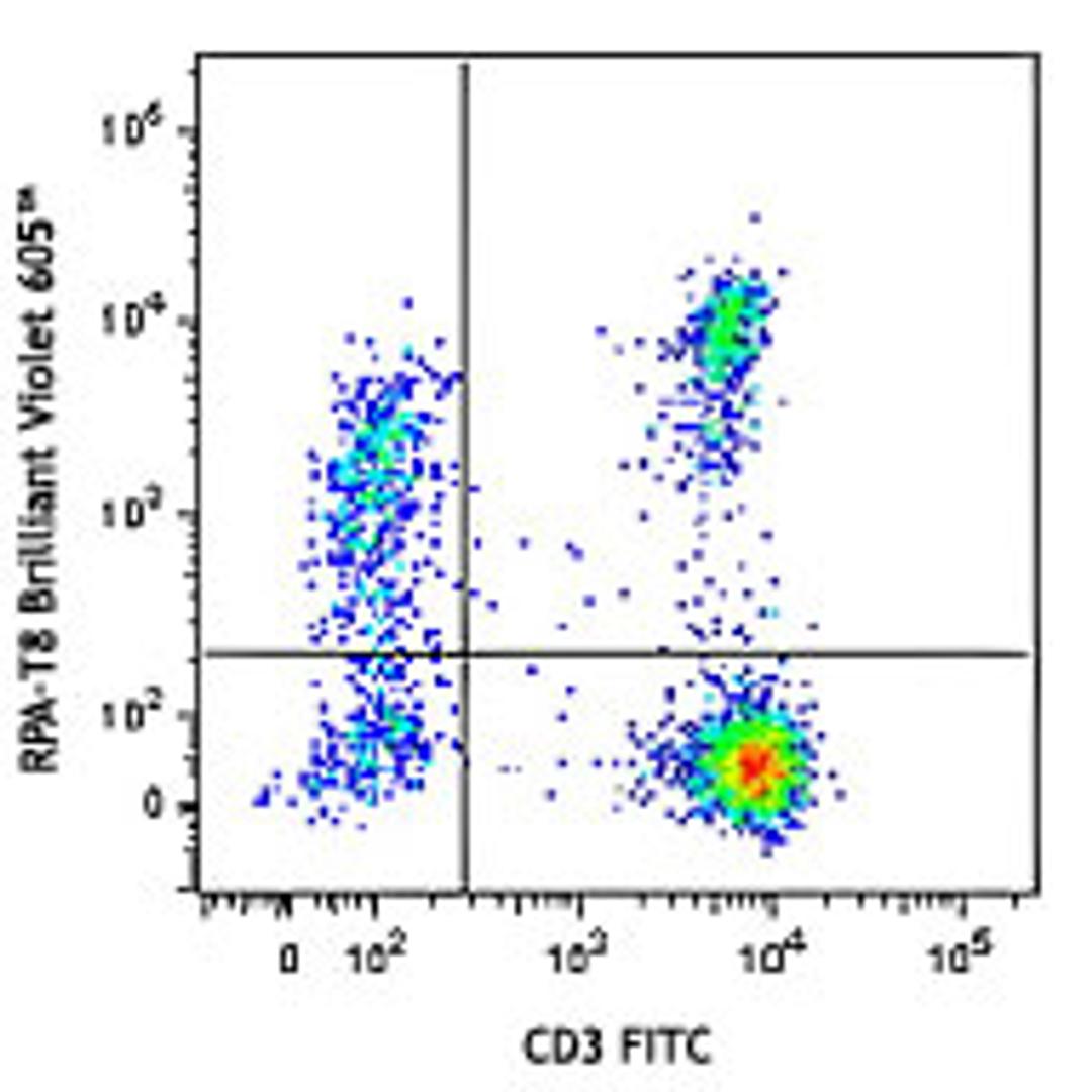 Brilliant Violet 605™ anti-human CD8a; Clone: RPA-T8; Reactivity: Human, Cross-Reactivity: Chimpanzee, Baboon, Cynomolgus, Rhesus, Pigtailed Macaque, Sooty Mangabey; Apps: FC; Size: 100 tests