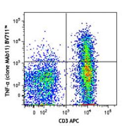 Brilliant Violet 711™ anti-human TNF-α; Clone: MAb11; Reactivity: Human, Cross-Reactivity: Chimpanzee, Baboon, Cynomolgus, Rhesus, Swine (Pig, Porcine), Pigtailed Macaque, Sooty Mangabey; Apps: ICFC, FC; Size: 25 tests