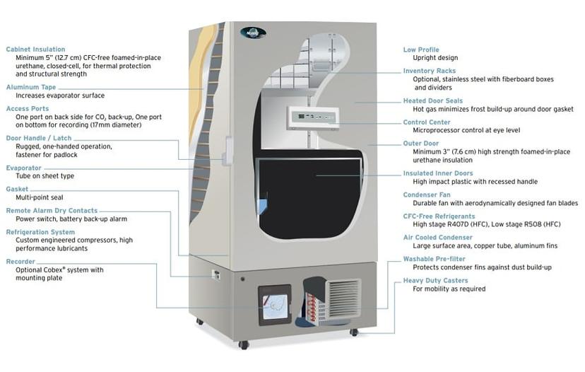 There are a variety of design options available, all of which have benefits and drawbacks for certain laboratories and applications. For example, chest freezers are more efficient than the upright design, but due to space limitation in most laboratories, the upright is the more popular choice.