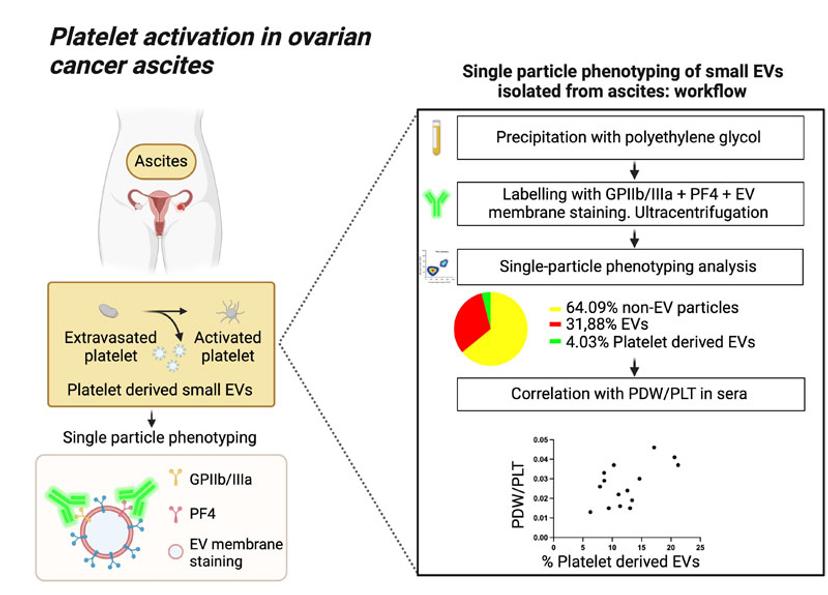 The combined analyses of all >45nm particles with specific characterization of sub-populations of interest allowed for deconvolution of data, predicting a correlation between % of EVs with platelet markers and the PDW/PLT. This could allow for biofluid extractions to be used in assessing the extent of platelet activation in ascites of ovarian cancer patients.