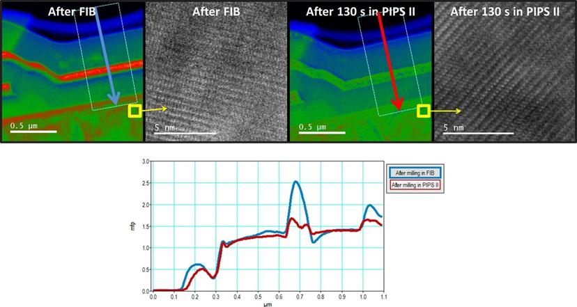 Figure 5. Color images (left) show sample thickness maps* in the device, captured after milling in FIB (H-bar) and low energy milling in PIPS II system (300 eV beam, stationary milling mode, 130 s). Sample thickness is compared in these two images using profile lines averaged along the graph arrows shown below. TEM micrographs (right) show high resolution images taken before and after low energy ion milling in PIPS II system (taken from yellow square areas shown on the thickness maps). By reducing sample thickness, parts of FIB-induced sample surface damage have been removed. FIB prepared specimen provided by Texas Instruments, Dallas Texas. *Rainbow color scale on the thickness maps varies from 0 (black) to 4 (white) mfp.