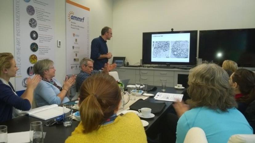 In his presentation Trevor Hinwood (Distributor for RMC) explored sample preparation techniques for the use of scanning electron microscopy in back scatter electron detection mode which produces images quite equivalent to TEM images at magnifications up to 10,000x. Steve Pfeiffer (RMC-Boeckeler) presented 3D methods including serial block face SEM (3View, SBFSEM), focused ion beam (FIB-SEM) and the automatic tape-collecting microtome (ATUMtome). All of these techniques have the capability of producing thousands of images or sections in serial order. Terence Da Silva (ZEISS Microscopy) introduced ZEISS Atlas 5 Array Tomography with an automated approach to image acquisition and data collection. The workshop participants Eric Hannsen (University of Melbourne) and Rick Webb (University of Queensland) presented work done with their current imaging systems, also highlighting the future potential of these technologies.