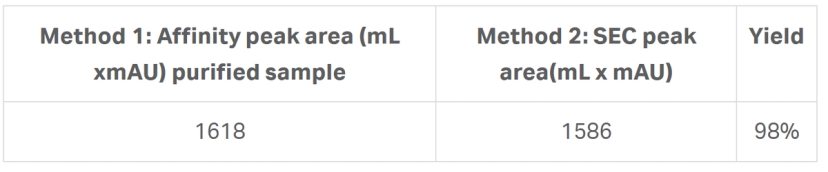 The affinity purified sample was automatically loaded onto the SEC column and eluted in a clean peak, as expected at 1.6 min corresponding to the monomeric size of the mAb (150 kDa) (Fig 8).