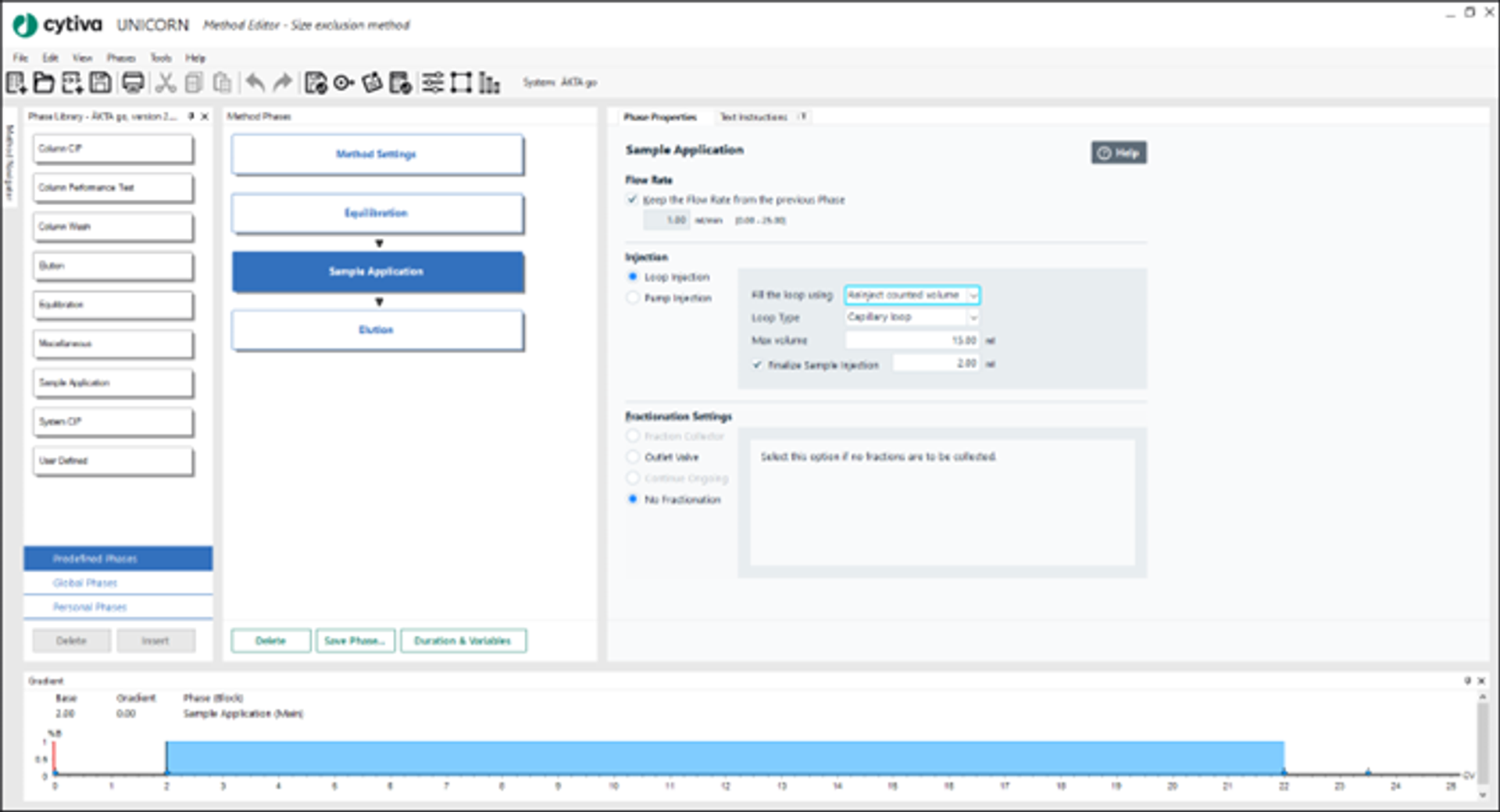 ÄKTA go system is fully supported by UNICORN software, which gives real-time control of the chromatography system. Automated methods can be created in minutes for most common chromatography techniques using predefined methods. In this application, the methods below were generated using predefined methods (Fig 3).