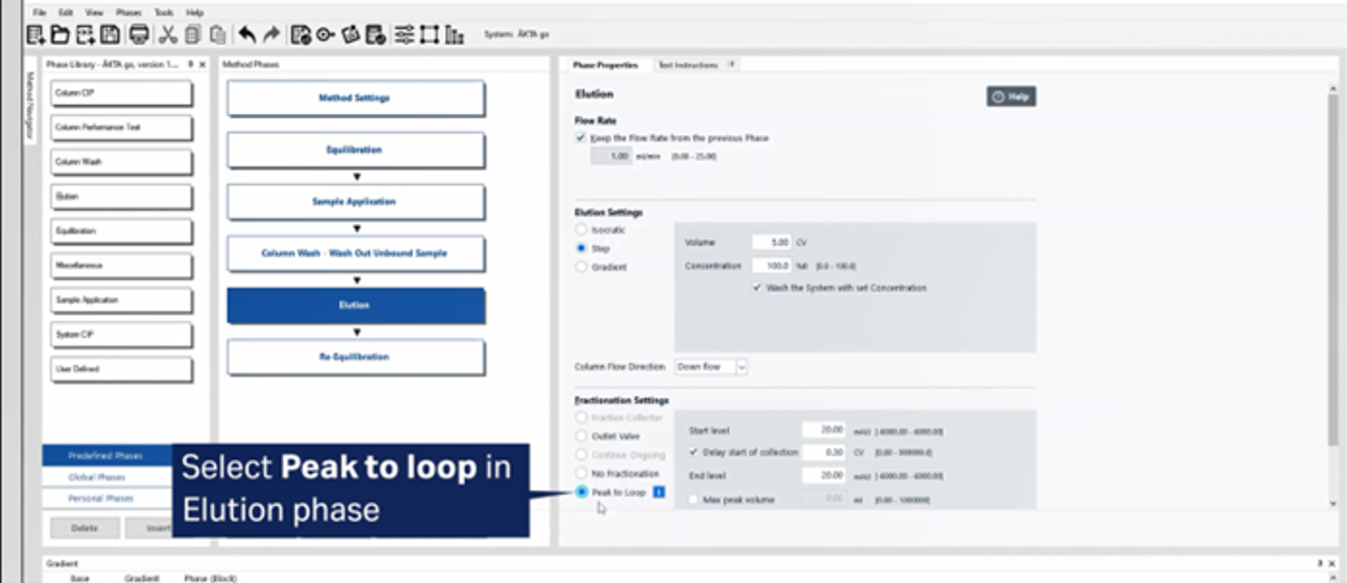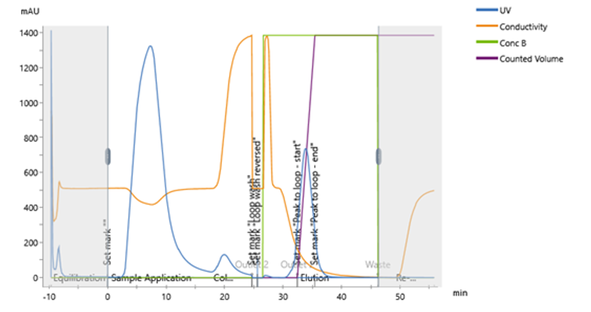 Fig 5. To collect the intermediate peak from the first purification step, the functionality Peak to loop was selected in UNICORN software.