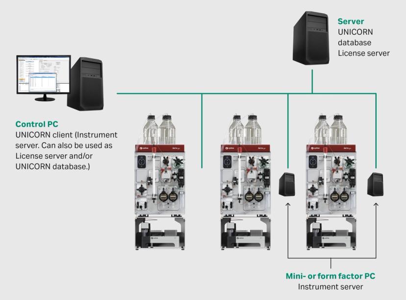 Fig 1. Multiple ÄKTA go systems can be connected and controlled from one computer. To save space, mini- or form factor PCs with individual UNICORN licenses can be used to run the instrument server for each system in the setup.