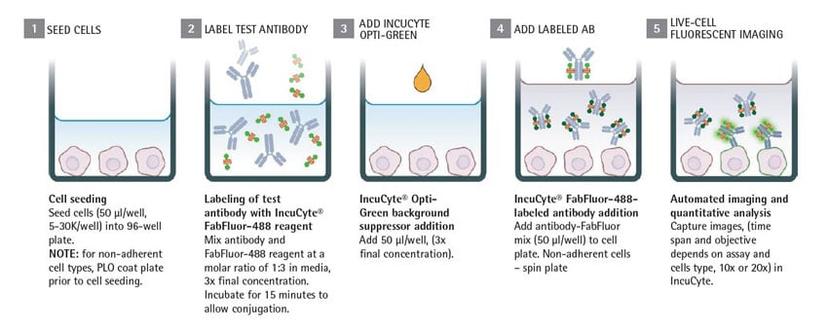 Live-cell ICC on the IncuCyte platform draws on the strengths of the instrument’s live-cell analysis capabilities, coupled with conventional fluorescently-labeled antibody binding. Using a simple mix, no-wash protocol, the antibody of your choice is first tagged with a fluorescently-labeled antigen-binding fragment. This is then added directly to your living cells, setting the stage for your live-cell ICC imaging. Adding in a background suppressor such as the IncuCyte Opti-Green helps obtain clean signals.