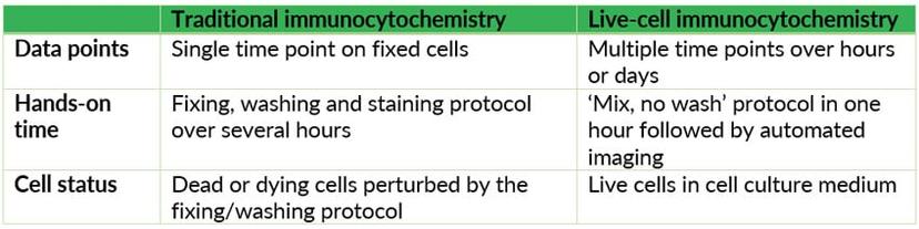 Along with the spatial resolution offered by conventional ICC, there is a need for temporal resolution that can reveal cellular states and cell-cell interactions, phenomena that cannot be visualized in fixed cells. Offering a way to capture cellular dynamics on live cells, while still keeping the benefits of ICC, Essen BioScience recently launched the IncuCyte® Live-Cell Immunocytochemistry.