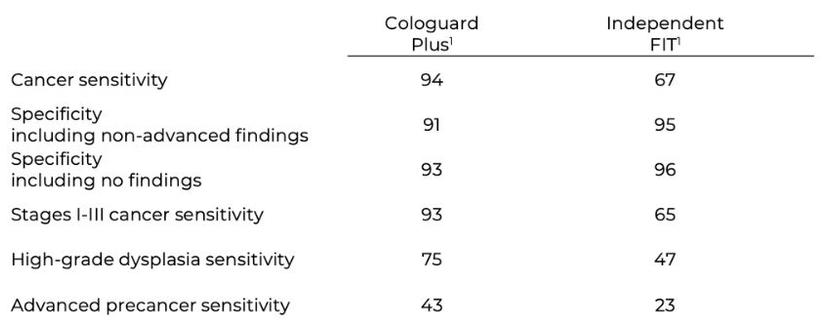 Results from BLUE-C also show Cologuard Plus significantly outperformed an independent FIT* for overall CRC sensitivity, treatable-stage CRC (stages I–III) sensitivity, high-grade dysplasia sensitivity, and advanced precancerous lesion sensitivity.