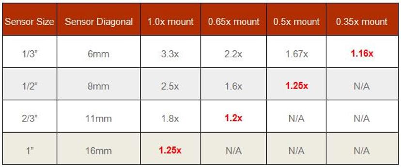 In order to counter this magnification effect you can match the camera sensor with the c-mount adapter as follows (Table 1). E.g. a camera with a 1/2" sensor is best matched with a 0.5x c-mount: