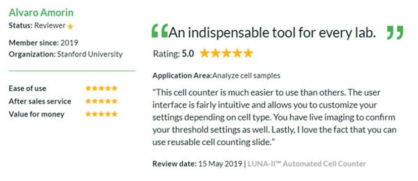 Don't just take our word for it, read reviews left by scientists to help you choose the best instruments for your lab, or share your opinion to help your peers by writing your own review today. Read one of our latest reviews below by Alvaro Amorin from Stanford University for the LUNA-II™ Automated Cell Counter by Logos Biosystems, Inc.