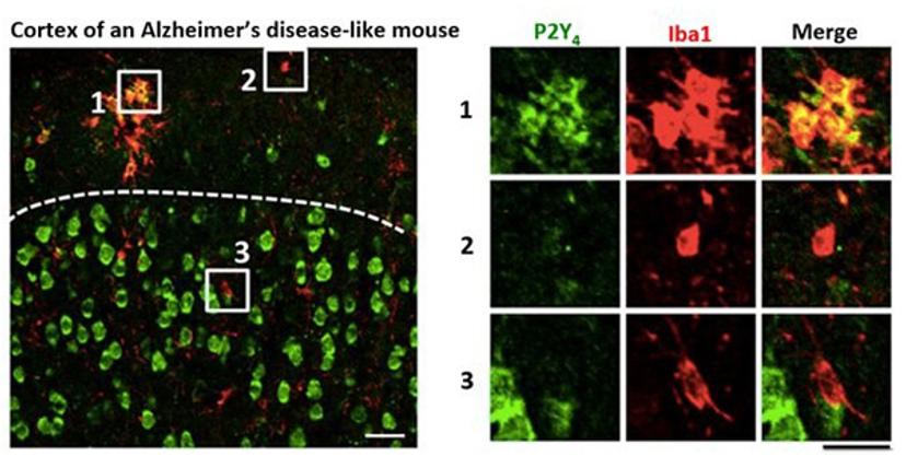 HL: Immunostaining is an irreplaceable technique in biological studies, with numerous benefits. It is an easy and reliable approach that allows in situ identification of microglial states and gene expression patterns. In our studies of purine-mediated pinocytosis, I co-stained P2Y4 purinoreceptors and Iba1, a microglial marker, in brain sections of APPswe/PS1dE9 mice, a transgenic model of Alzheimer’s disease and found that resting microglia – that are far away from amyloid plaques – look ramified, and expressed an undetectable-to-low level of P2Y4. However, levels of P2Y4 expression in microglia that were concentrated around amyloid plaques and transformed into an amoeba-like morphology were dramatically enhanced. This result associates P2Y4 with its function, i.e. mediating clearance of β-amyloid. Immunostaining is also an excellent approach to specify subcellular localization of proteins. For example, in the same article, by immunostaining, I identified that P2Y4 receptors and phosphorylated Akt were both enriched on ATP-induced membrane ruffles and newly-formed pinosomes. These results suggest the potential role of these molecules in pinosome formation and lead us to test the necessity and sufficiency of the activation of the P2Y4-PI3K-Akt pathway in purine-induced pinocytosis.