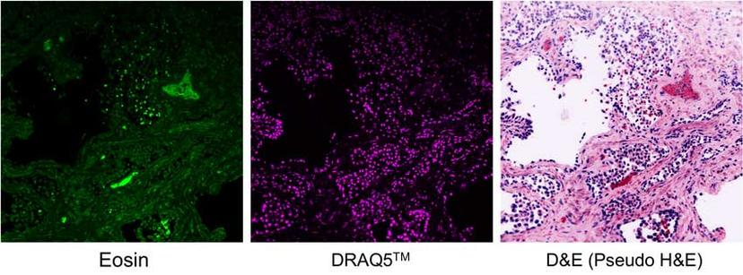 “Instead of H&E we now have D&E that can be paired with optical methods such as SIM during a surgery for imaging the entire surface of freshly resected tumors, or with selective plane illumination microscopy (SPIM) for imaging tumor biopsies in 3D. With just a 1- to 3-minute incubation, we can stain an entire biopsy tissue volumetrically with DRAQ5 and eosin to get a high-fidelity match to H&E,” adds Dr. Brown.