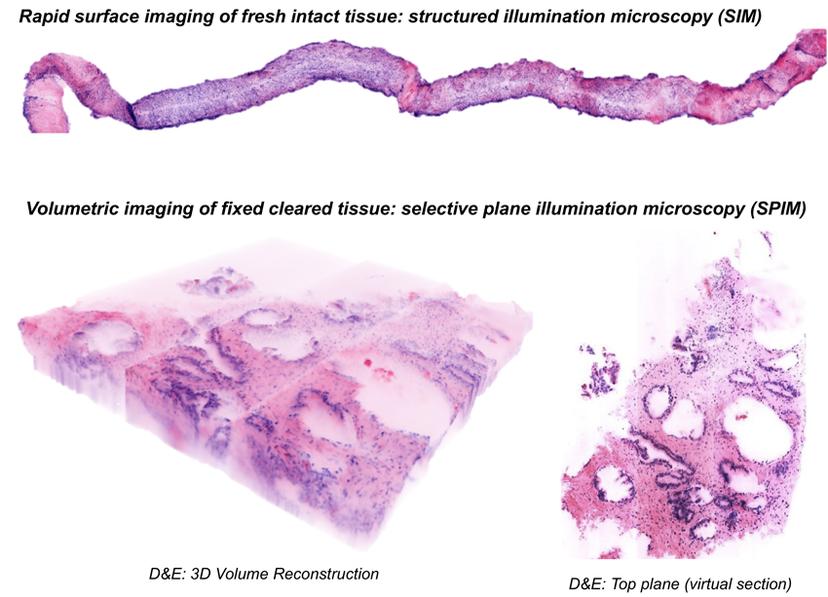 D&E (DRAQ5 and eosin) is a general method that can be combined with different types of optical sectioning microscopy for different applications such as, structured illumination microscopy (SIM) (top), and selective plane illumination microscopy (SPIM) (bottom). (Image courtesy of the Brown lab)