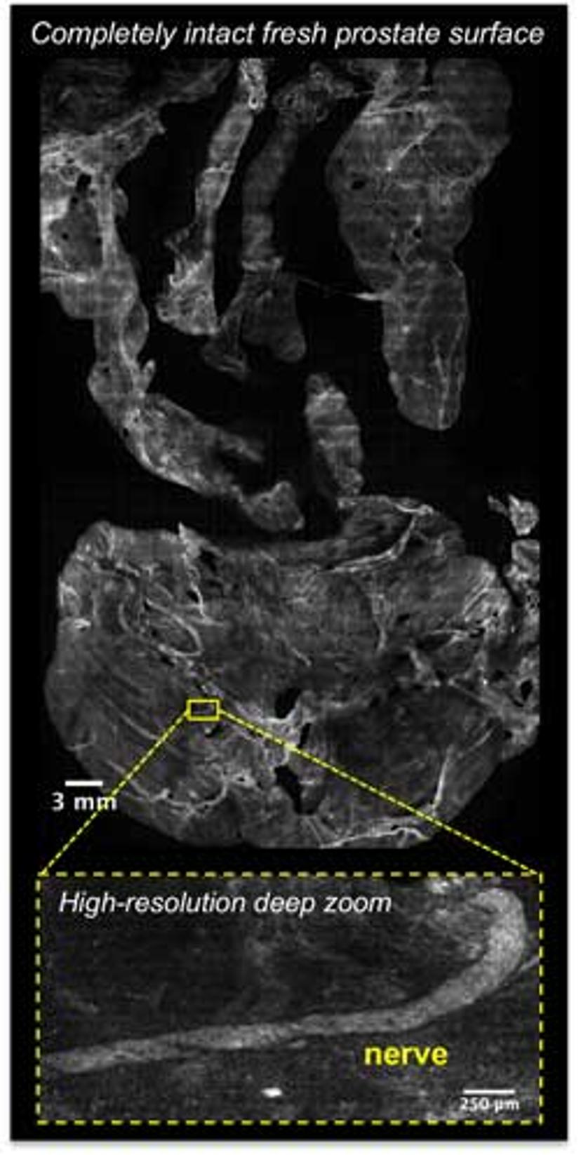 In a study published in Scientific Reports, the team used structured illumination microscopy (SIM) to directly examine the surface of the prostate taken out during surgery. “As opposed to a single layer of cells in vitro or a sliced piece of frozen tissue section, we’re looking at tissue that’s thick and fresh out of the body, basically the whole organ. We need to cut it somehow. Rather than physically cut them, we optically cut it,” explains Dr. Brown.