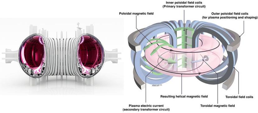 (Left) An artistic representation of the doughnut-shaped magnetic confinement reactor or tokamak. (Right) A schematic of the electric and magnetic fields that create the plasma. [Images courtesy of CCFE.]