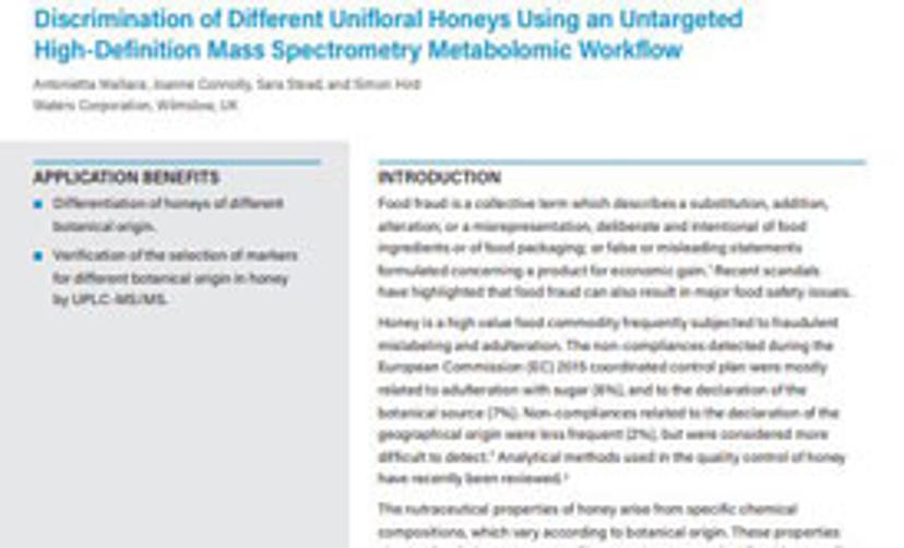 Honey is a highly valuable food commodity, which is often subjected to mislabeling and adulteration. The identification of a honey's floral origin is an important step in ensuring food quality. In this application note, the differentiation of honey from different botanical origins is demonstrated using an untargeted metabolomics approach via UPLC -MS/MS.