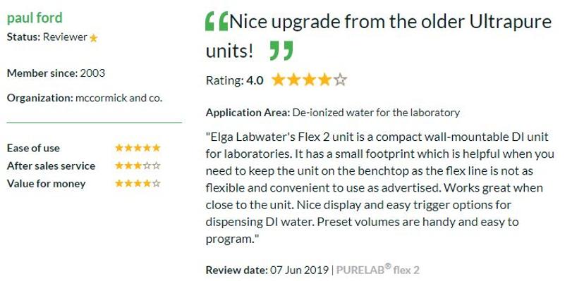 Don't just take our word for it, read reviews left by scientists to help you choose the best instruments for your lab, or share your opinion to help your peers by writing your own review today. Read one of our latest reviews below by Paul Ford from McCormick & Co. for the PURELAB® flex 2 from ELGA LabWater.
