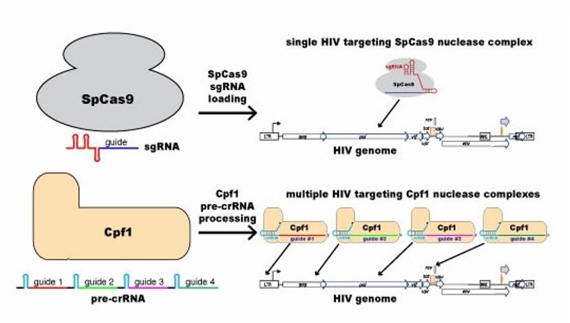 This figure illustrates the difference between “conventional” single-target CRISPR/Cas9 (most widely used by molecular biologists) and the multi-target CRISPR/Cpf1 that Luban and Wolfe will use to attack the HIV-1 genome.