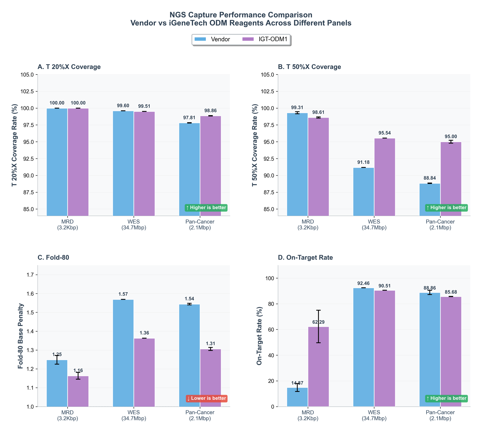 Coverage depth metrics indicated that both reagent sets achieved high T20× coverage rates, reflecting sufficient overall depth. However, the customized reagent demonstrated higher T50× coverage rates in several panels, suggesting improved depth consistency across targets. Fold 80 values were comparable or lower for the customized reagent, indicating a more uniform distribution of sequencing coverage without increasing sequencing depth or altering workflow parameters.