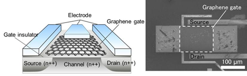 Fujitsu Laboratories have developed a gas sensor that operates on a new principle, in which the gate part of a silicon transistor is replaced by graphene. This sensor can detect concentrations lower than tens of parts per billion (ppb) of nitrogen dioxide (NO2) and ammonia (NH3); with nitrogen dioxide in particular, sensitivity has improved more than tenfold, to less than 1 ppb.