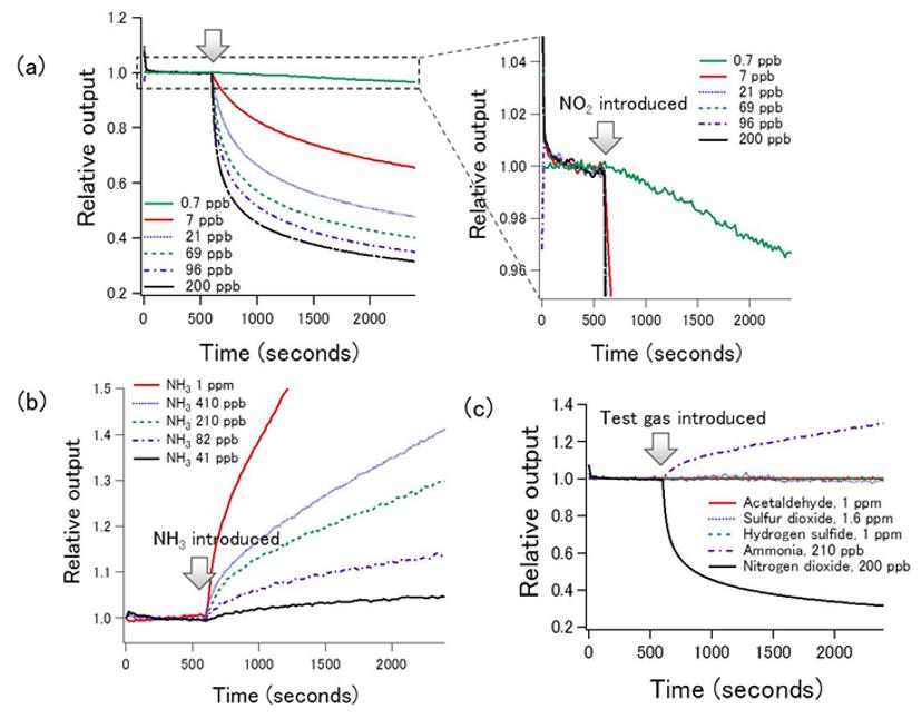 A sensor based on this principle has been created that measures a few tens of ppb of ammonia and less than 1 ppb of NO2 in a nitrogen environment. Among the gases expected to be found in analyses of the air or human breath, the results of tests have demonstrated that it reacts only to NO2 and NH3, meaning that it can detect only specific gases (Figure 3).