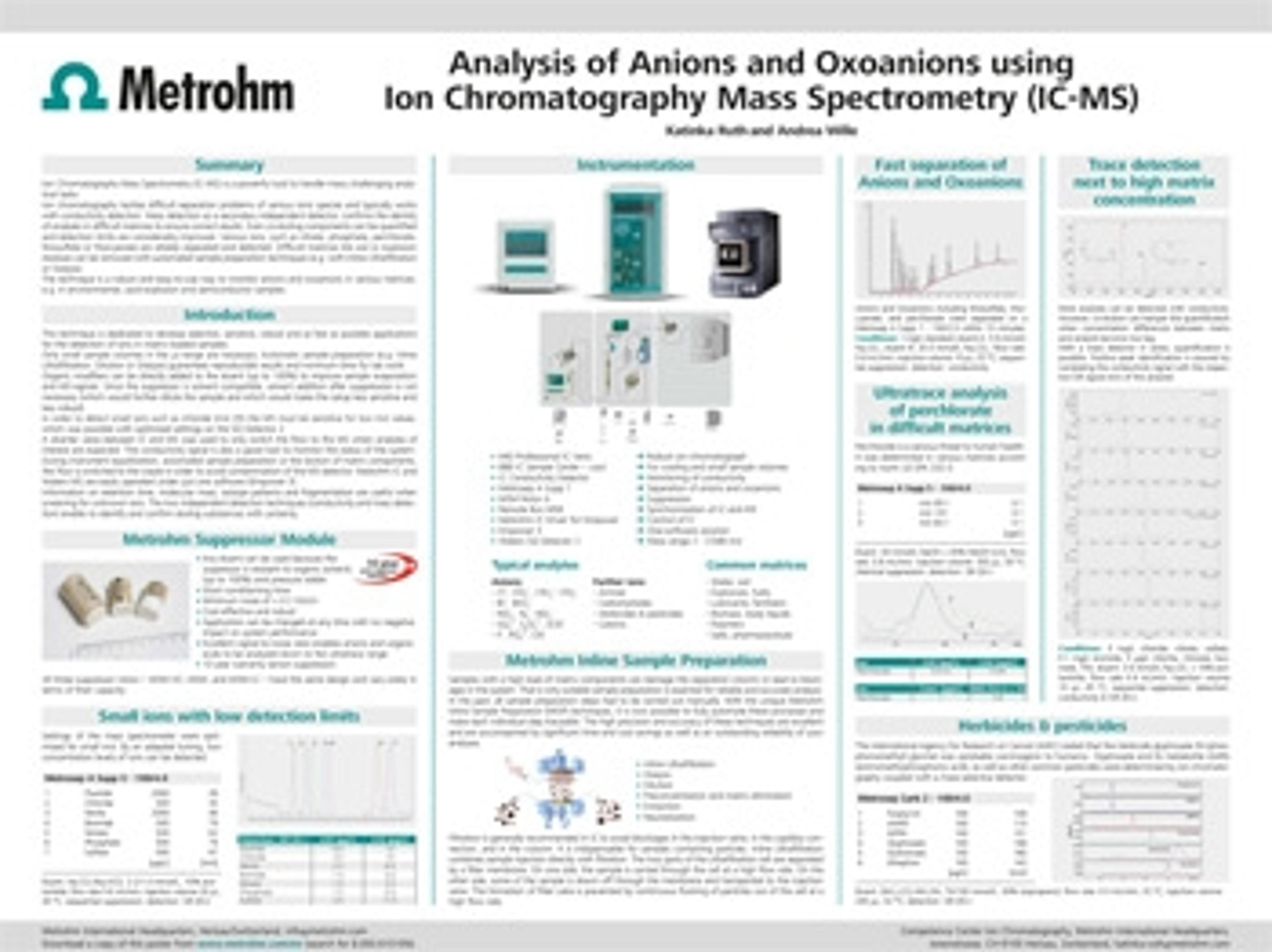 Ion Chromatography Mass Spectrometry (IC-MS) is a powerful tool to handle many challenging analytical tasks. Ion chromatography tackles difficult separation problems of various ionic species and typically works with conductivity detection. Mass detection as a secondary independent detector, confirms the identity of analytes in difficult matrices to ensure correct results. Even co-eluting components can be quantified and detection limits are considerably improved. Various ions, such as nitrate, phosphate, perchlorate, thiosulfate or thiocyanate are reliably separated and detected. Difficult matrices like soil or explosion residues can be removed with automated sample preparation techniques (e.g. with Inline Ultrafiltration or Dialysis). The technique is a robust and easy-to-use way to monitor anions and oxoanions in various matrices, e.g. in environmental, post-explosion and semiconductor samples.