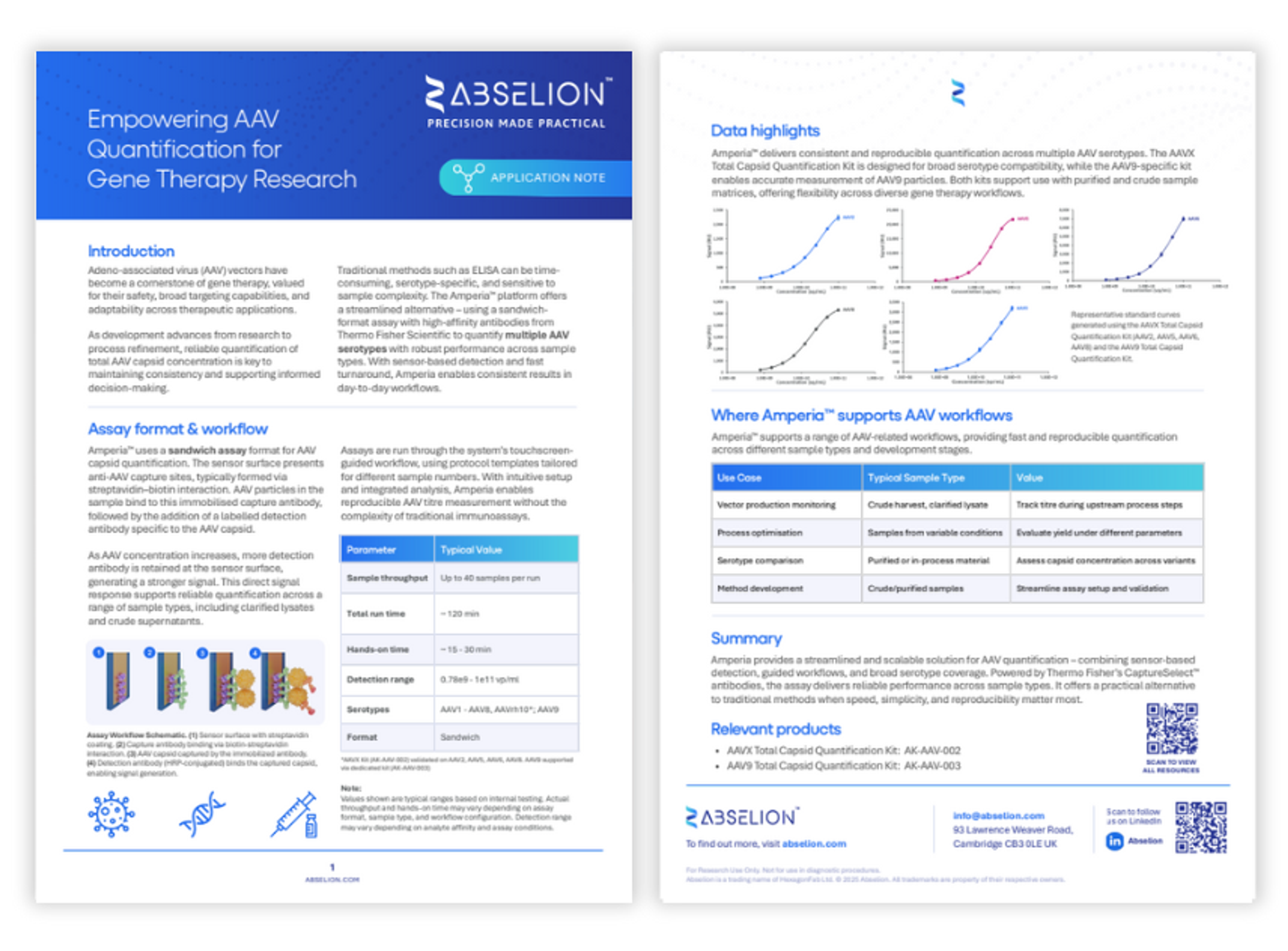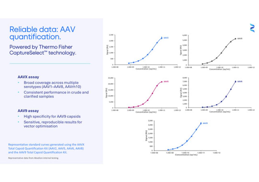 The AAVX and AAV9 Total Capsid Quantification Kits extend the Amperia™ Protein Quantification System for streamlined measurement of adeno-associated virus (AAV) vectors. Incorporating CaptureSelect™ affinity reagents from Thermo Fisher Scientific, the kits provide robust, reproducible assays for both broad serotype coverage and AAV9-specific quantification.