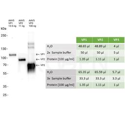 This set of recombinant AAV5 VP1, VP2 and VP3 can be used to create a mixture with the precise molar ratio of 1:1:10 to compare the protein composition of the viral capsid in your sample by protein detection methods, e.g. western blot.