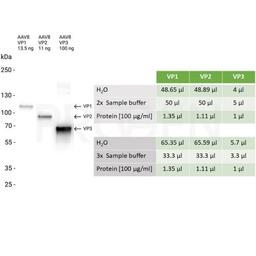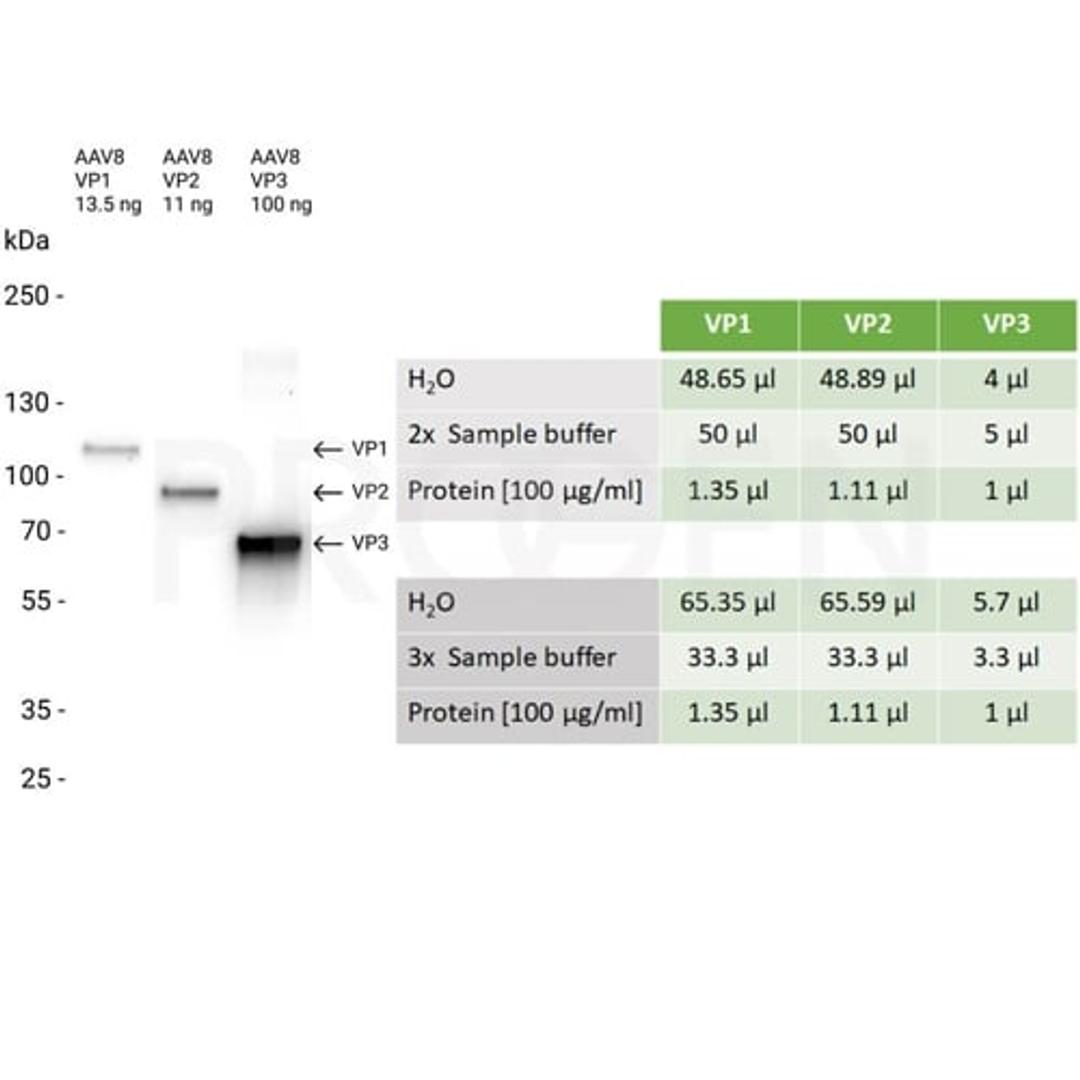 This set of recombinant AAV5 VP1, VP2 and VP3 can be used to create a mixture with the precise molar ratio of 1:1:10 to compare the protein composition of the viral capsid in your sample by protein detection methods, e.g. western blot.