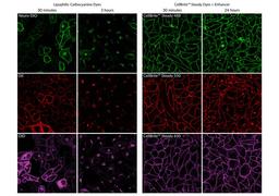 Unlike other membrane/cell surface stains that are rapidly lost from the cell surface by endocytosis after labeling, CellBrite® Steady Dyes equilibrate between intracellular compartments and the plasma membrane. Cells retain surface staining in addition to intracellular staining over the course of hours to days in culture. CellBrite® Steady Enhancer is an optional reagent included in the kits that can be used to mask intracellular fluorescence of CellBrite® Steady Dyes, for more selective visualization of cell boundaries.