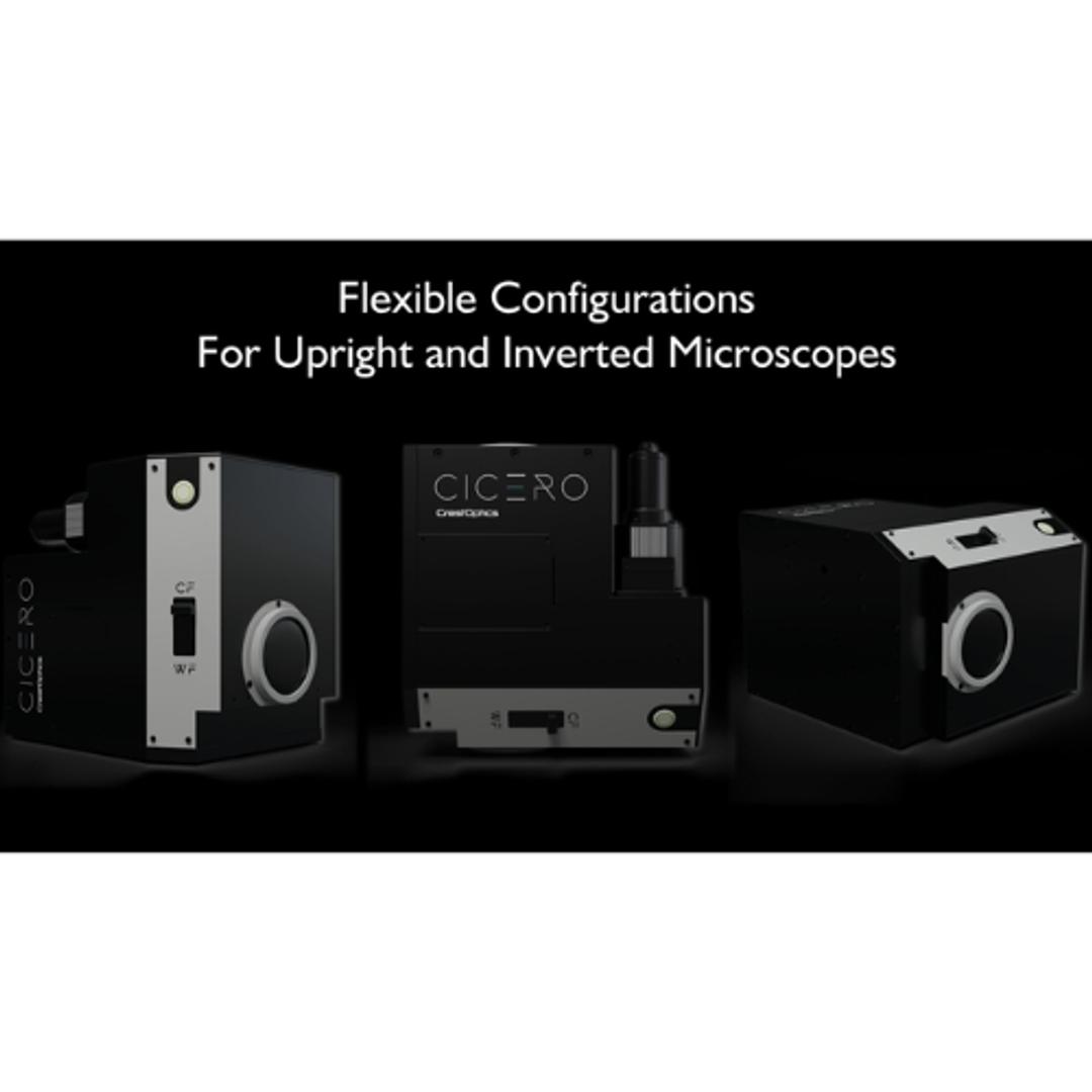 - Configuration - Uniquely designed, CICERO fits upright and inverted microscope frames with a C-camera port, providing maximum configuration flexibility. CICERO allows seamless integration with all major microscopy systems and ensures a pleasant user experience. Any user can include widefield and confocal images in their daily work. The disk is hosted in a sealed compartment securing a dust-free environment throughout the System's lifespan, ensuring no artefacts on images and downtime for cleaning.