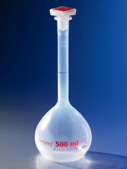 Translucent flask is supplied with tapered polypropylene stopper with an individually calibrated graduation line. The product is manufactured to Class A tolerances as defined by ISO 1042. They are supplied with an imprinted lot number and certificate. These flasks may be autoclaved to 121ºC without affecting the graduation tolerance. Recommended routine cleaning up to 60ºC will preserve graduation markings. Height dimension is…