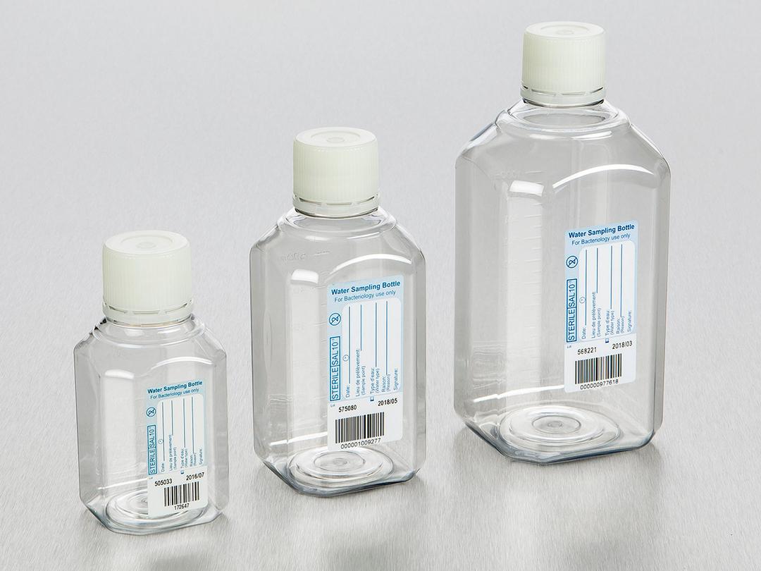 Break-resistant polyethylene terephthalate (PET) or High-density Polyethylene (HDPE)Molded graduationsLeak-proof tamper-evident HDPE screw capsAvailable with or without sodium thiosulfateTraceable labelsLarge openings minimize risk of contaminationFilm-packed or individually bagged