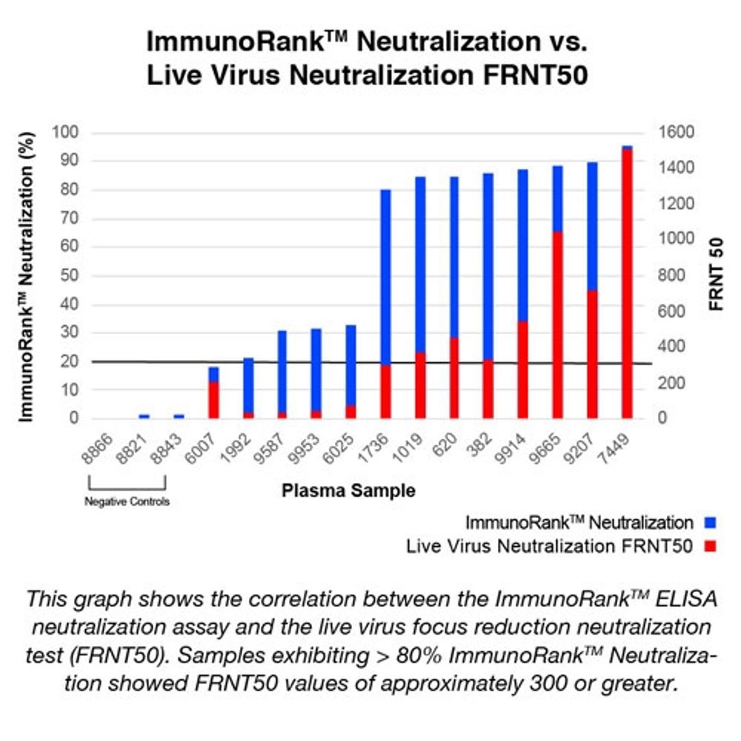 The COVID-19 ImmunoRank™ Neutralization MICRO-ELISA is a test for semi-quantitative detection of SARS-CoV-2 neutralizing antibodies in plasma or serum. This assay is intended for detection of circulating SARS-CoV-2 neutralizing antibodies of all Ig classes and to identify individuals who have mounted an adaptive immune response to SARS-CoV-2 indicating recent or prior infection. At this time, it is unknown for how long antibodies persist following infection and if the presence of neutralizing antibodies confers protective immunity. The COVID-19 ImmunoRank™ Neutralization MICRO-ELISA test should not be used to diagnose acute SARS-CoV-2 infection. Use of this test is limited to research use only applications and not for In vitro diagnostic use.