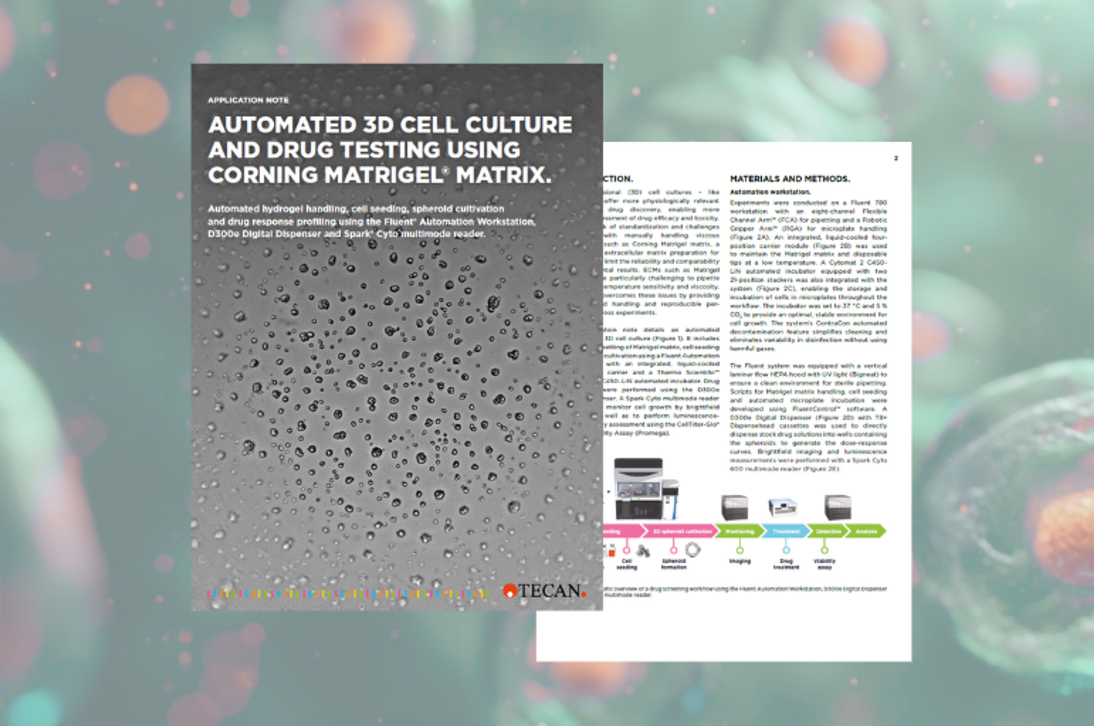 This application note details an automated workflow for 3D cell culture. It includes controlled pipetting of Matrigel® matrix, cell seeding and spheroid cultivation using a Fluent Automation Workstation with an integrated, liquid-cooled four-position carrier and a Thermo Scientific™ Cytomat™ 2 C450-LiN automated incubator. Drug treatments were performed using the D300e Digital Dispenser. A Spark® Cyto multimode reader was used to monitor cell growth by brightfield imaging, as well as to perform luminescence-based viability assessment using the CellTiter-Glo® 3D Cell Viability Assay (Promega).