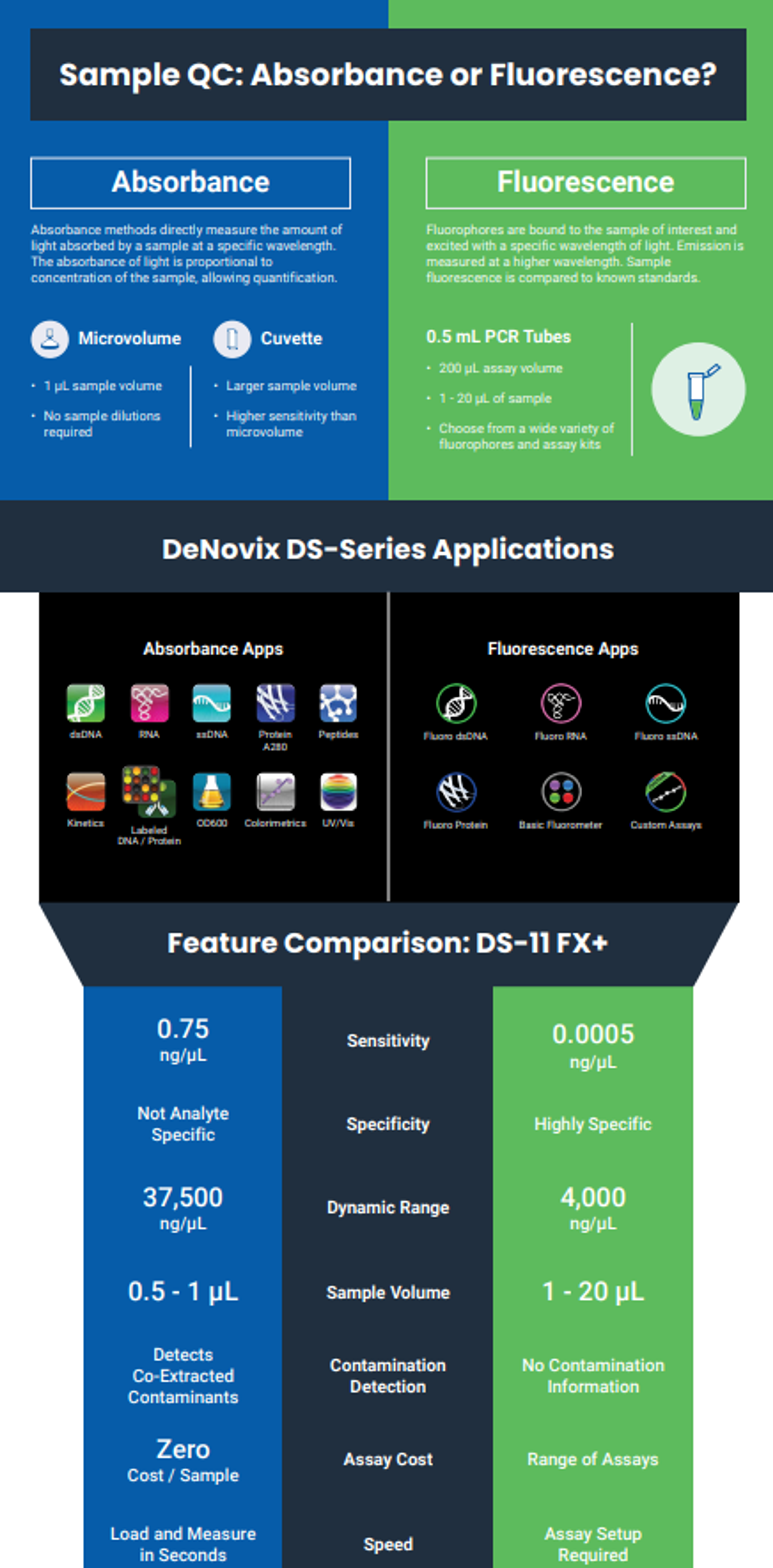 Discover how the DS-11 Series spectrophotometers/fluorometers from DeNovix combine 1 µL UV-Vis, cuvette UV-Vis, and fluorescence into one instrument. Explore how the DS-11 Series combines the ease of use, wide dynamic range, and contamination detection of UV-Vis with the enhanced sensitivity and specificity of fluorescence quantification. This flexibility allows the DS-11 Series to excel in a wide range of applications.