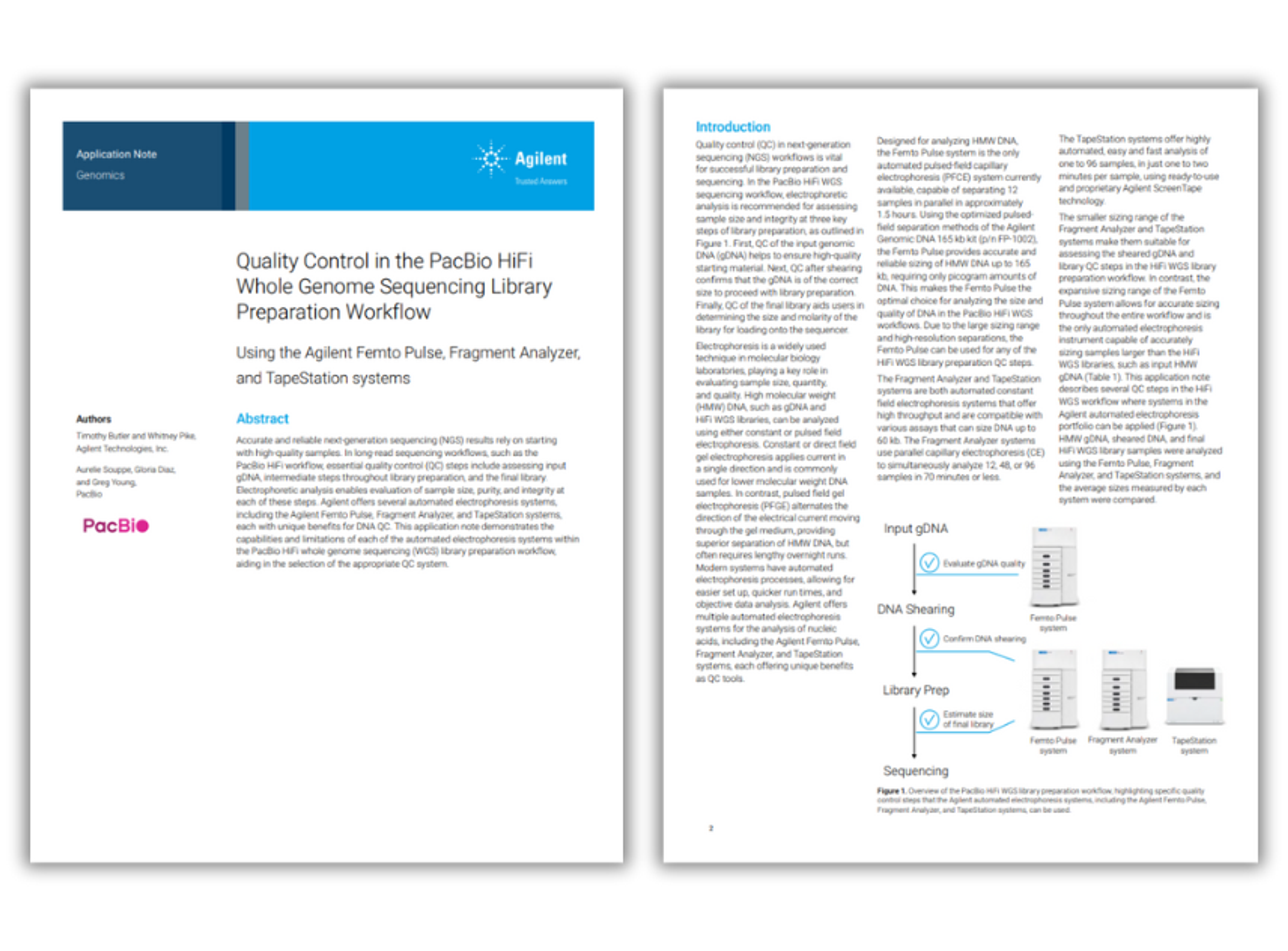 This application note demonstrates the capabilities and limitations of each of the automated electrophoresis systems within the PacBio HiFi whole genome sequencing (WGS) library preparation workflow, aiding in the selection of the appropriate QC system.