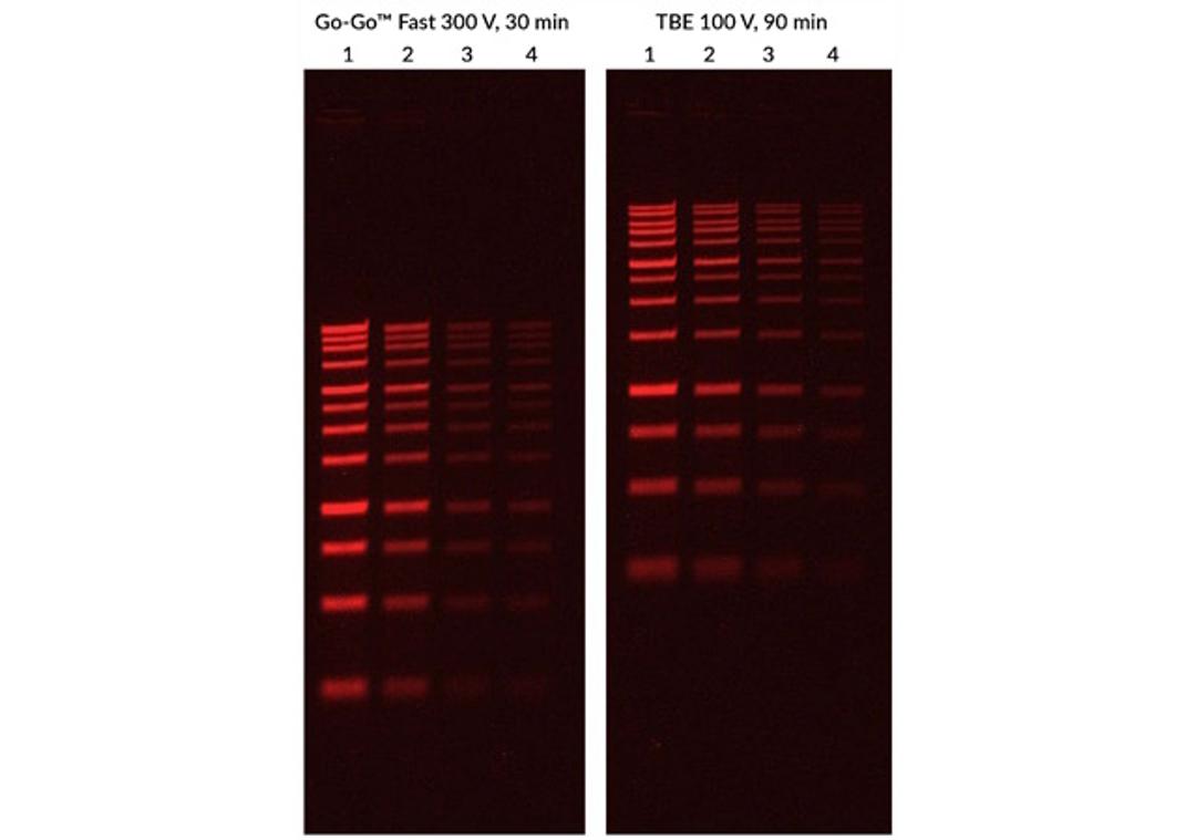 Go-Go™ Fast DNA Gel Running Buffer is a novel low ionic strength running buffer that allows you to run DNA agarose gels at higher voltage to get results up to 3X faster than with TAE or TBE buffer, streamlining routine DNA gel analysis. Go-Go™ Fast buffer also gives crisper band resolution compared to conventional electrophoresis buffers.