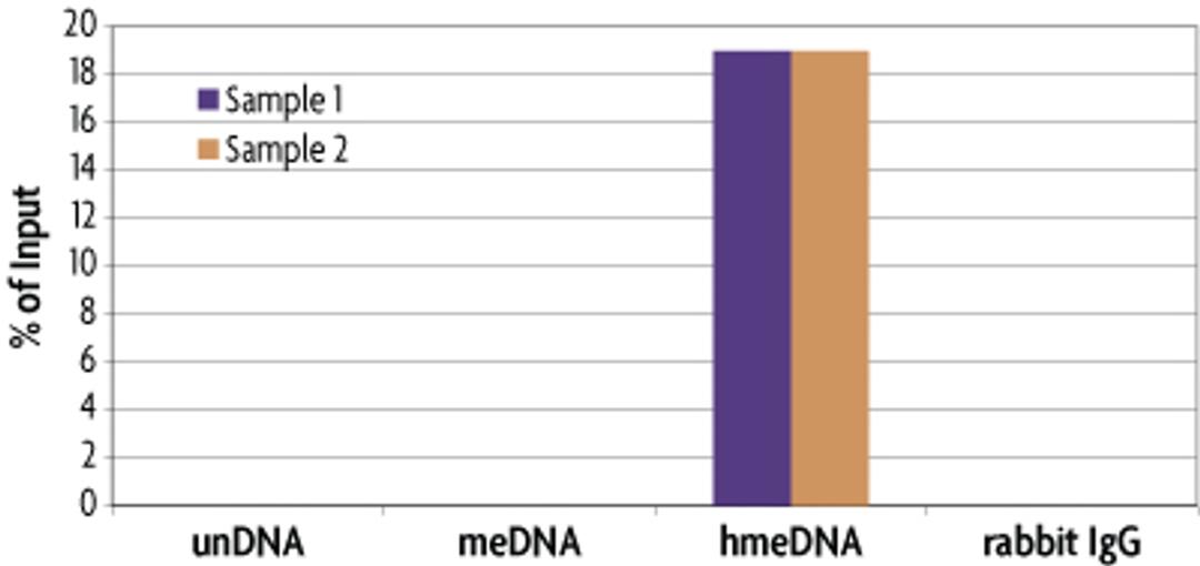 The hMeDIP Kit contains a highly specific purified 5-hmC antibody and the necessary buffers to perform methylated DNA immunoprecipitation (MeDIP). The affinity of the antibody enables separation of 5-hmC DNA from 5-mC DNA. Additionally, the antibody works to efficiently immunoprecipitate either double-stranded or single-stranded input DNA.