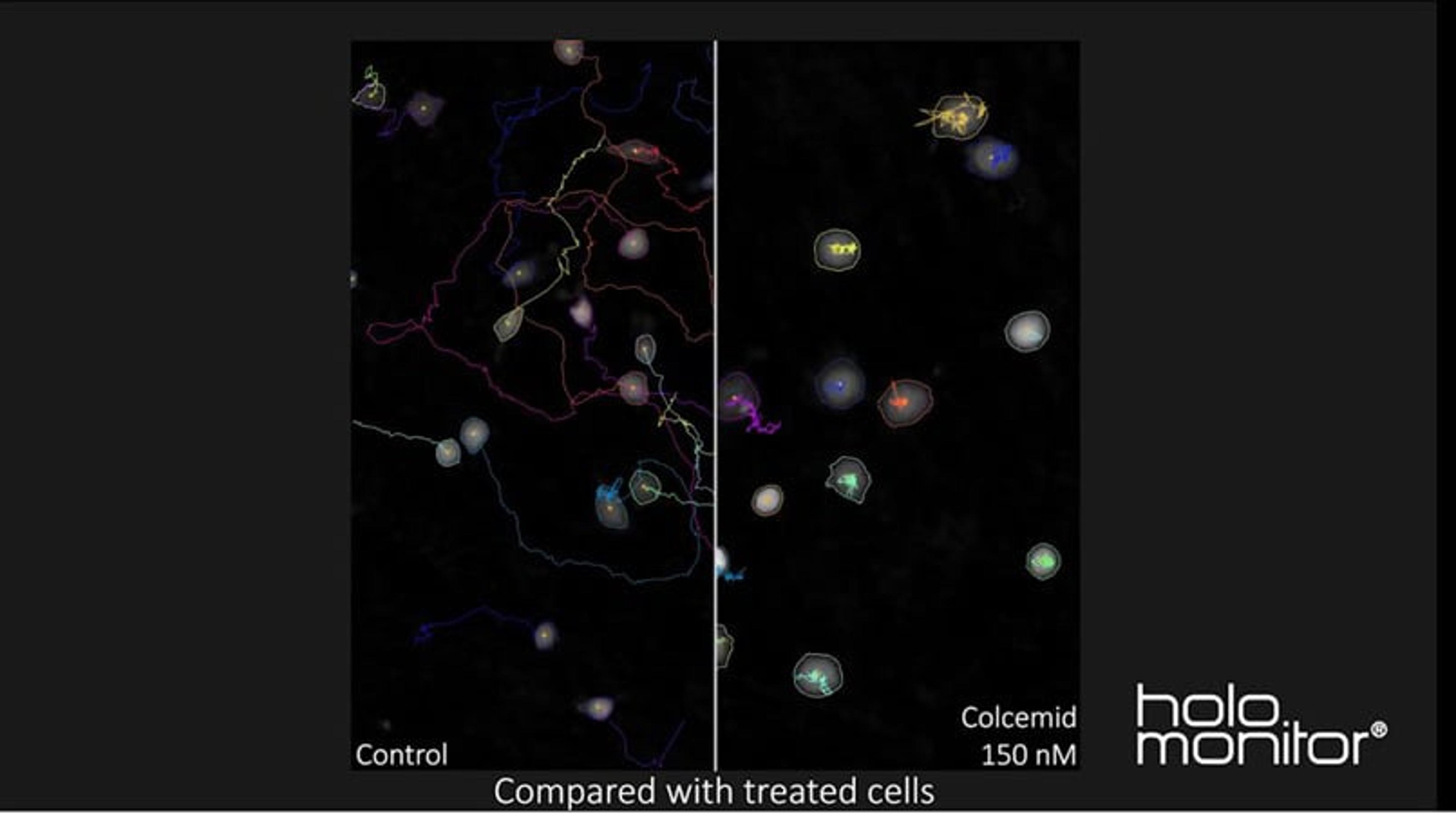 This video, by Phase Holographic Imaging, demonstrates spatial tracking of mouse fibroblasts (cell line: L929). Control cells and cells treated with the anti-cancer drug colcemid are tracked using HoloMonitor and then compared.