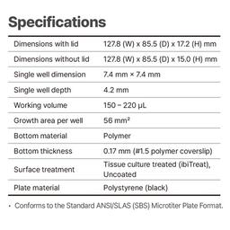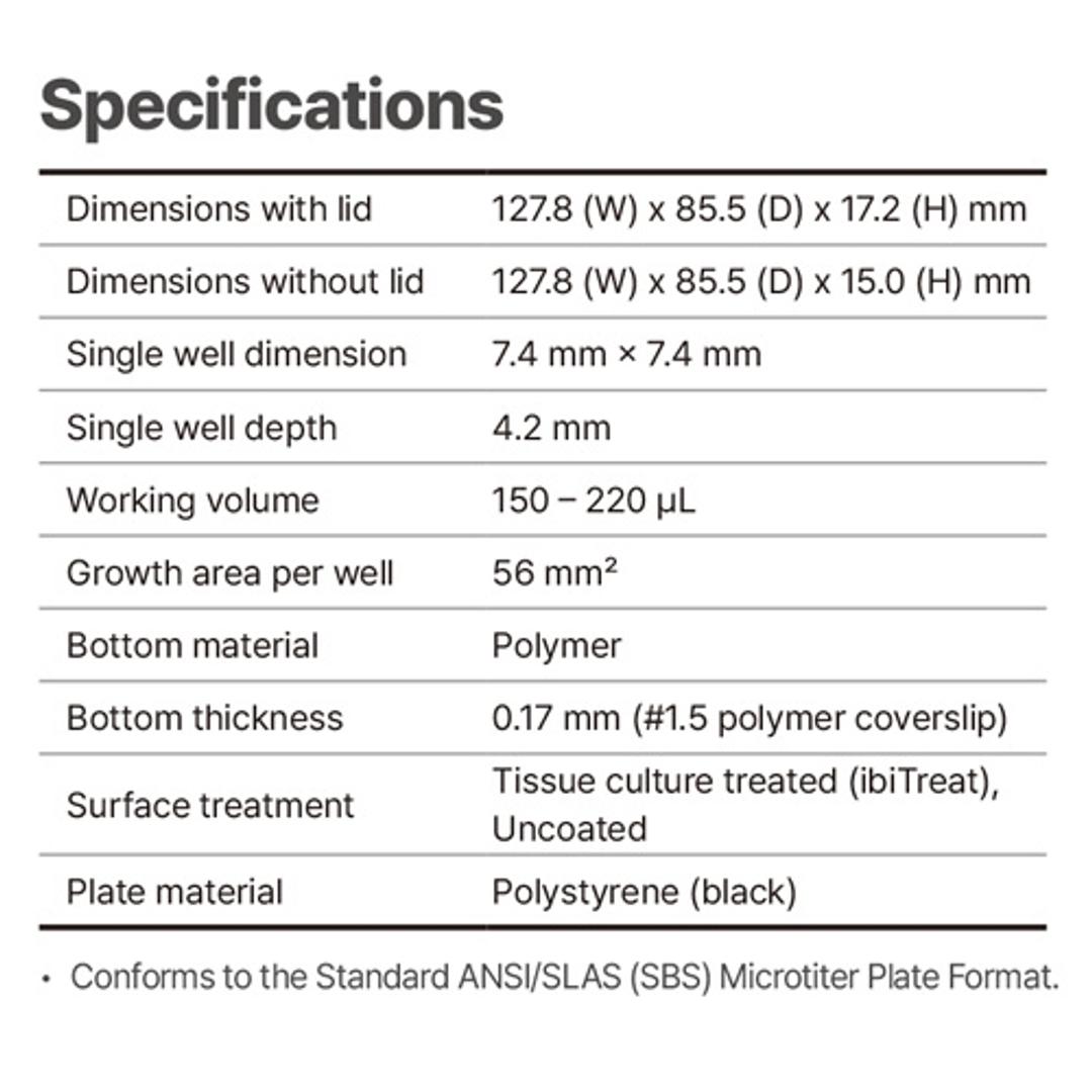 A black 96 well plate for high-content analysis, designed for use with Tomocube HT-X1 Holotomography system. This plate offers versatility in cell culture, holotomography and fluorescence microscopy.