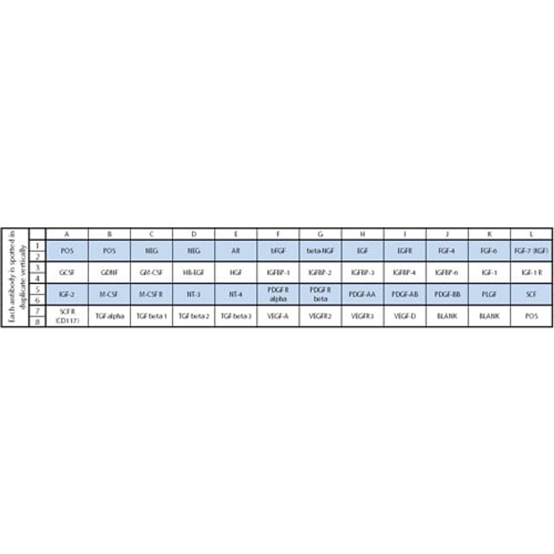 Amphiregulin, bFGF, beta-NGF, EGF, EGFR, FGF-4, FGF-6, FGF-7 (KGF), GCSF, GDNF, GM-CSF, HB-EGF, HGF, IGFBP-1, IGFBP-2, IGFBP-3, IGFBP-4, IGFBP-6, IGF-1, IGF-1 R, IGF-2, M-CSF, M-CSF R, NT-3, NT-4, PDGF R alpha, PDGF R beta, PDGF-AA, PDGF-AB, PDGF-BB, PLGF, SCF, SCF R (CD117/c-kit), TGF alpha, TGF beta 1, TGF beta 2, TGF beta 3, VEGF-A, VEGFR2, VEGFR3, VEGF-D
