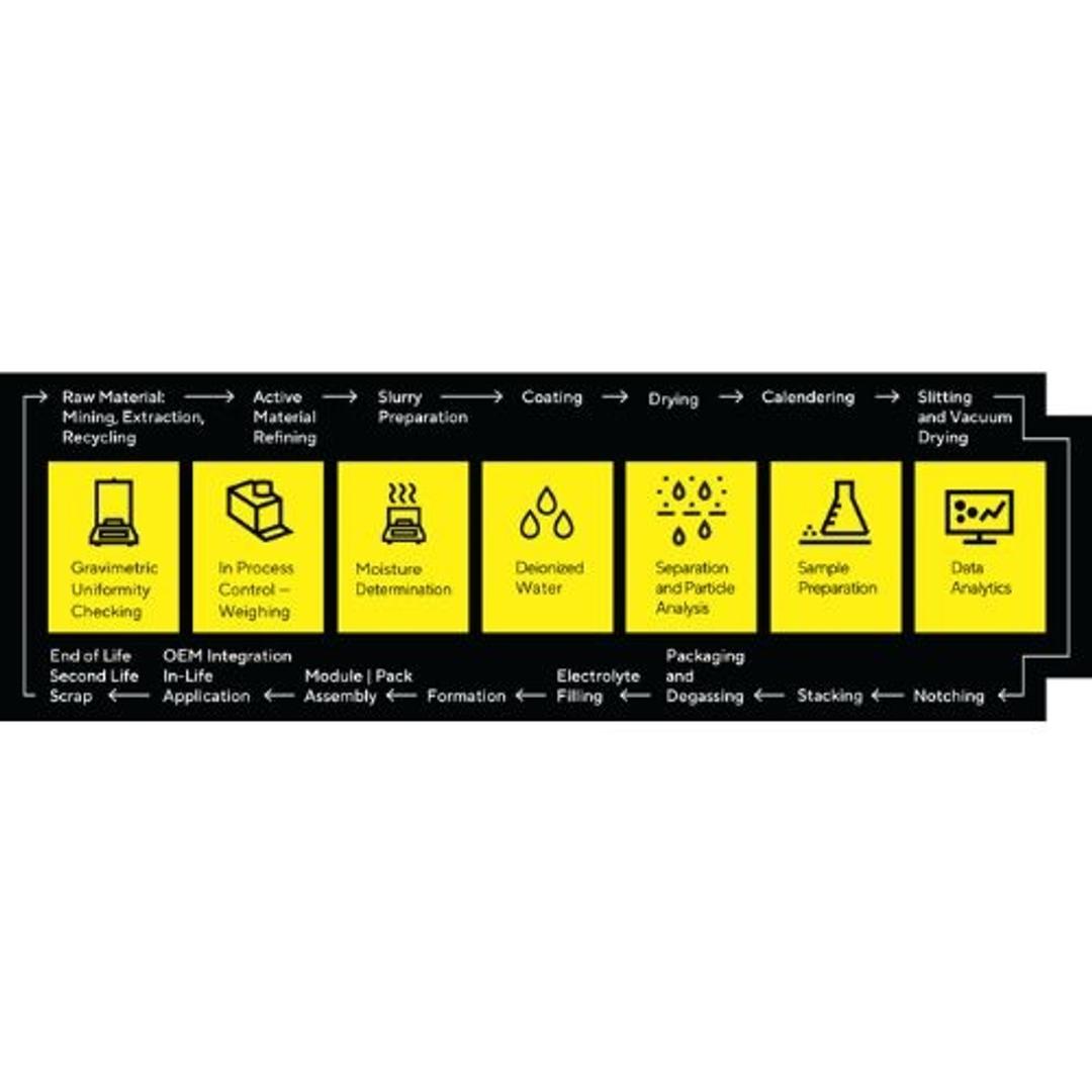 Sartorius provides solutions for several steps of the rechargeable battery manufacturing process - from material purity determination and in-process optimization to final release - with intuitive lab tools and integrated weighing solutions, further enhanced by multivariate data analytics.