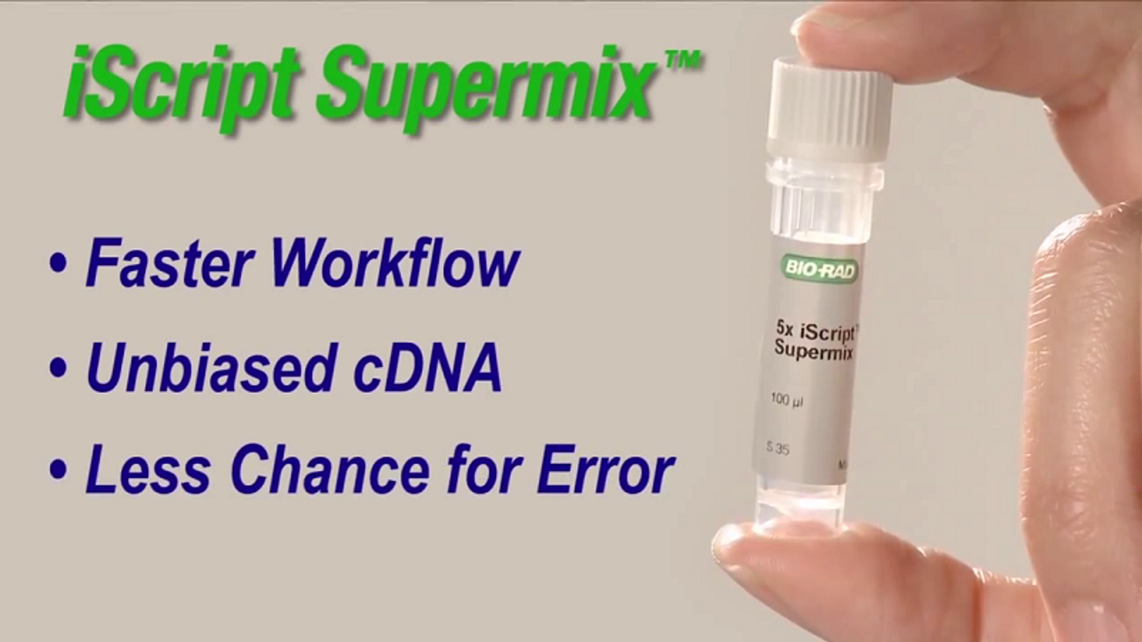 Watch this video to discover how Bio-Rad’s iScript™ Supermix can provide fast and simple RT-qPCR compared to a leading brand. Bio-Rad's iScript™ supermix is your single-tube, one-step solution for accurate and reproducible RT-qPCR results. See how iScript™ beats Brand X for cDNA synthesis in every way.