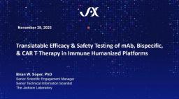 The Cytokine Release Syndrome (CRS) Studies from JAX are the only in vivo platform to assess the efficacy and safety of therapeutic agents, such as bispecific antibodies and chimeric antigen receptor T cells (CAR Ts). The Jackson Laboratory gives an overview of its PBMC Humanized Mice Based Platform, a novel assay that provides holistic toxicity and efficacy data, reveals multi-tissue and multi-organ responses, and enables a more accurate assessment of cytokine release. Donor-specific differences mimic the human pathophysiology in diverse populations and ultimately help de-risk the preclinical drug development pipeline.