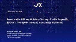 Immune humanized platforms, particularly utilizing highly immunodeficient mice, facilitate co-engraftment of human immune cells and tumors, enabling the evaluation of therapies targeting human-specific biological responses. These platforms efficiently incorporate multiple donors or tumor samples to model and predict human variation in response, and systemic consequences of toxic cytokine release for safety assessment. Dr. Brian Soper from The Jackson Laboratory presents preclinical data covering monoclonal antibody-based human immune modulation, donor-specific differences in bispecific antibody-mediated tumor efficacy and cytokine release, and CAR T cell-mediated tumor efficacy and safety.