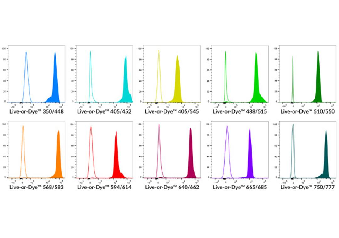 Live-or-Dye™ Fixable Viability Staining Kits allow discrimination between live and dead cells by flow cytometry or microscopy. Live/dead stains are useful probes to include when analyzing cell surface protein expression by flow cytometry, because they allow intracellular fluorescence signal from dead cells with permeable plasma membranes to be excluded from analysis.