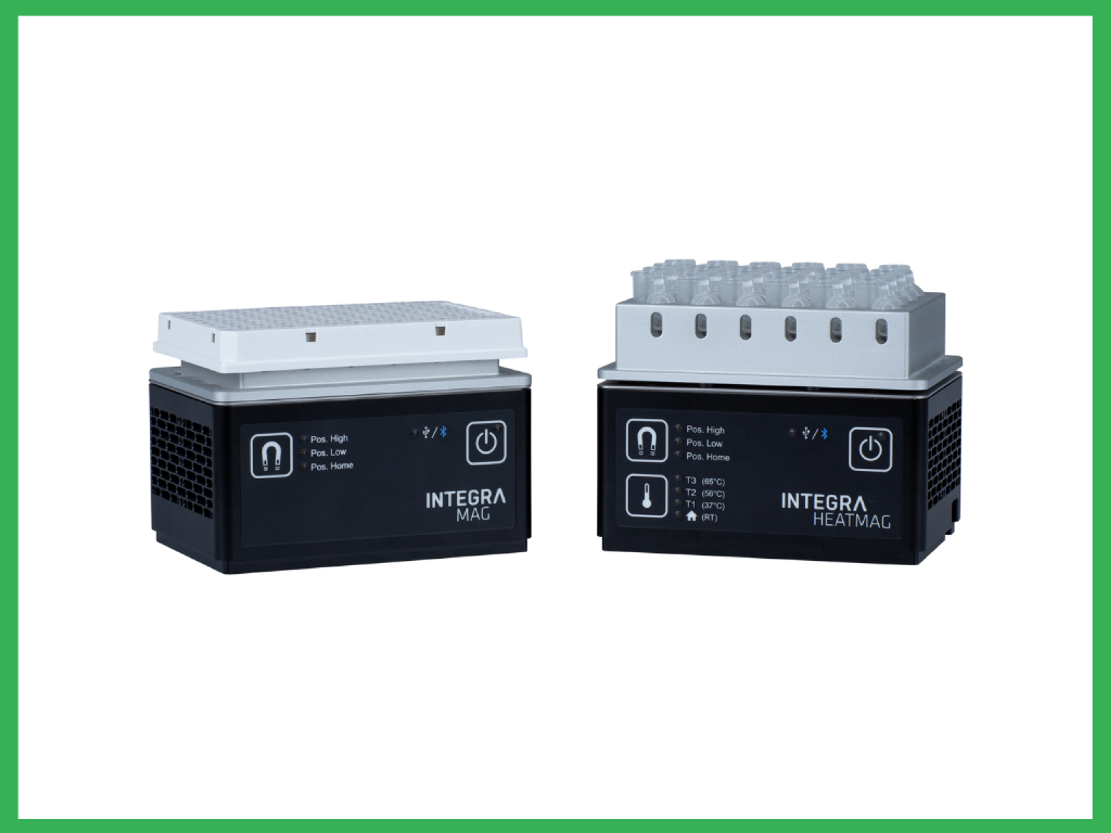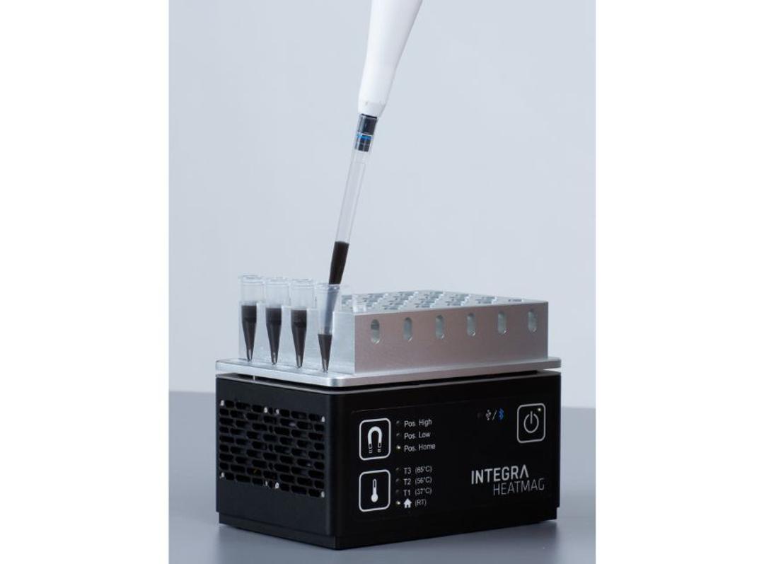 We have introduced the MAG and HEATMAG modules with you, the scientists, in mind. These cutting-edge solutions streamline magnetic bead purification in a broad range of molecular and proteomics workflows. The powerful magnets ensure fast bead collection with minimal loss and carryover, and their adjustable height can be customized to your volume requirements for optimal results every time. But that's not all; the HEATMAG module goes one step further by combining magnetic separation with heating capabilities, providing the perfect setting for nucleic acid extraction. It's a truly unique solution that sets INTEGRA apart from the rest.